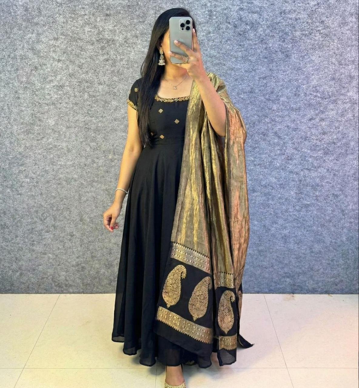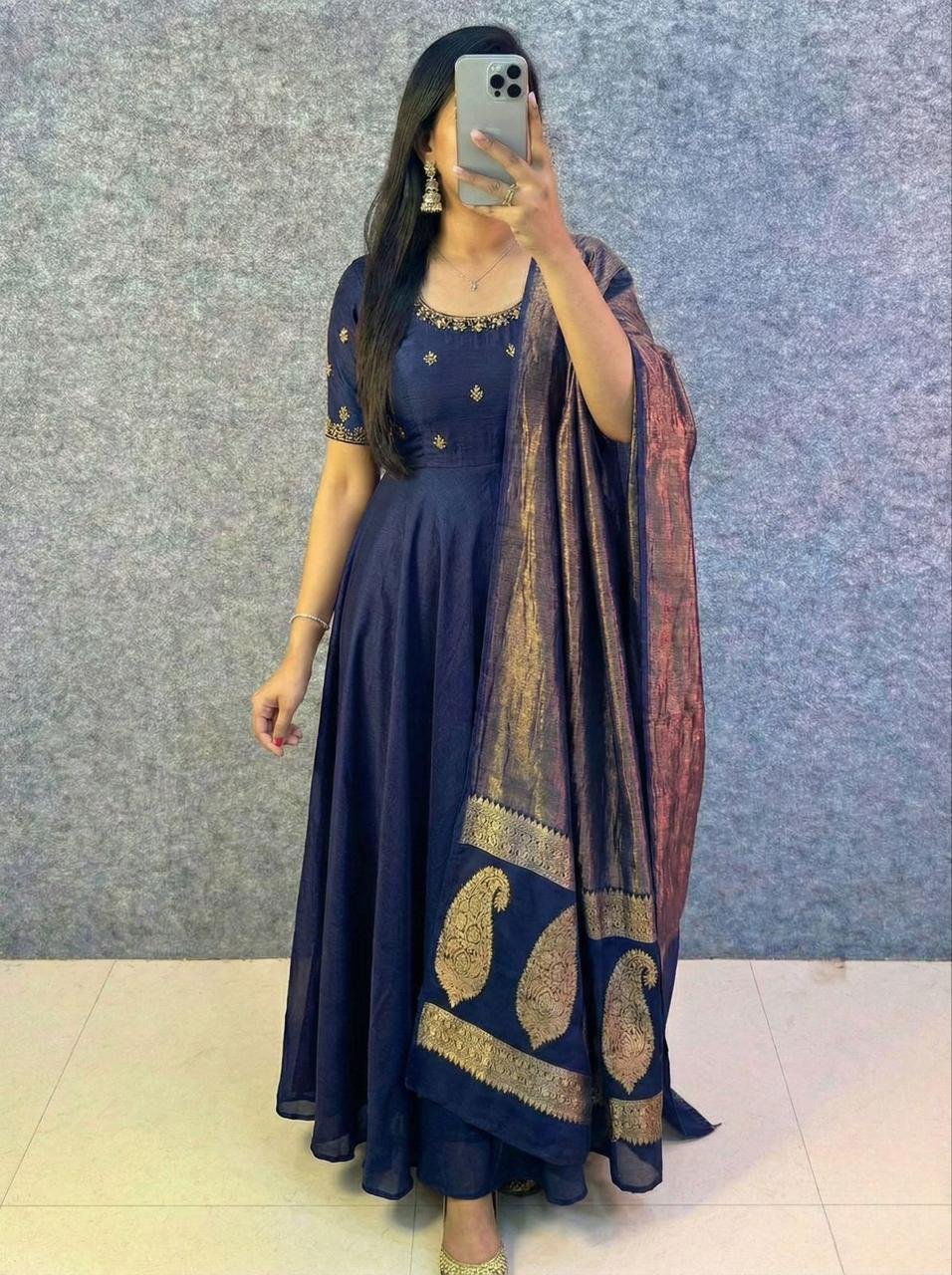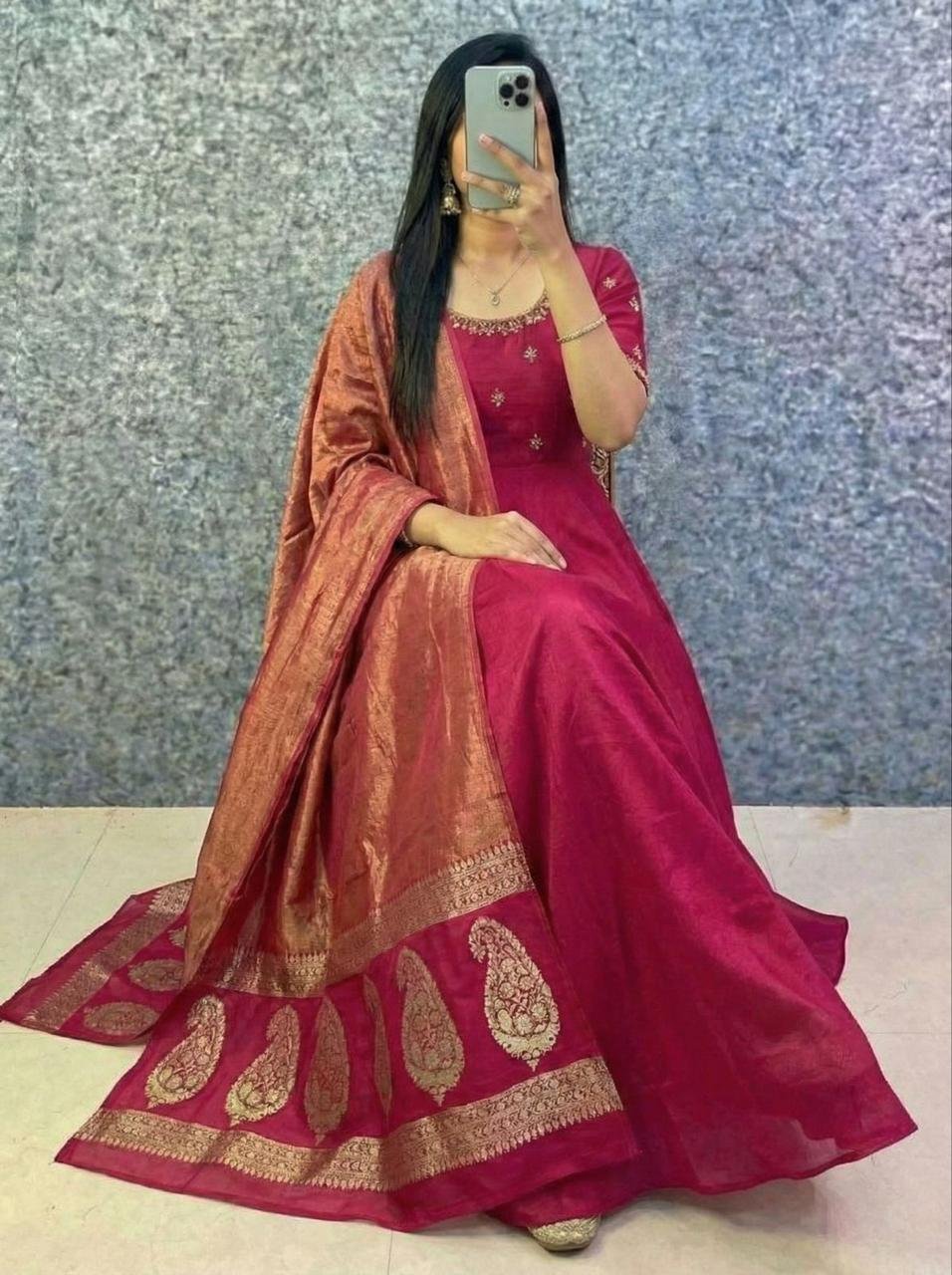 New Launching *vichitra silk *handwork / Maggam* *work* gown with Fully Handwork Sleeves women’s super collection with original modelling. Beautiful fully stitched designer gown with Banrasi Dupatta for Festive Season…